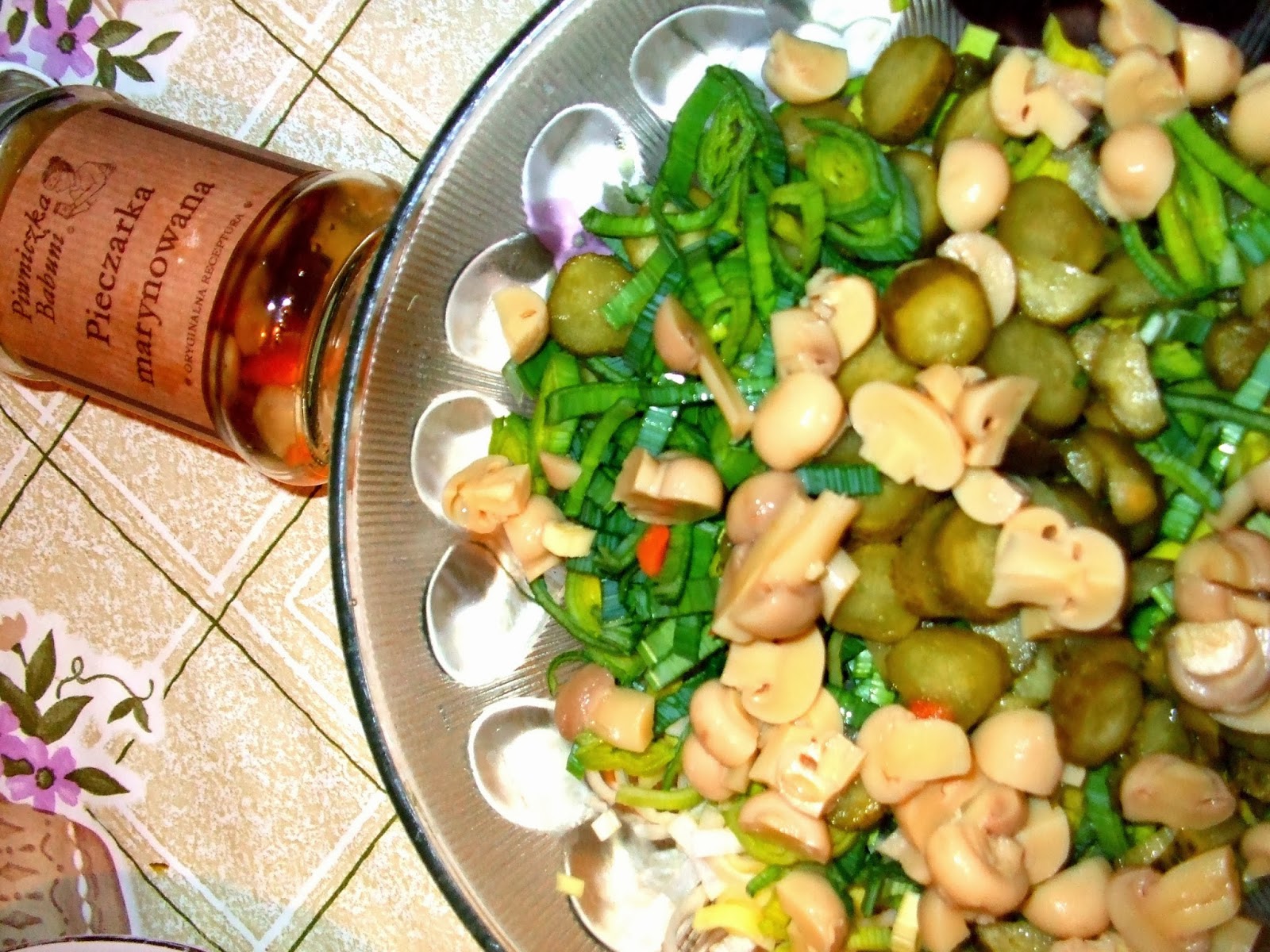 Por umyć, przekroić wzdłuż na pół i pokroić w plastry. Pieczarki odsączyć i pokroić (w zależności od wielkości, na pół lub ćwiartki). Ogórki pokroić w kostkę. Wszystkie składniki wrzucić do misy, dodać śmietanę i majonez i całość doprawić solą i pieprzem. Dokładnie wymieszać. Do surówki użyłam pieczarek z Piwniczki babuni. Są bardzo smaczne i malutkie, ładnie wyglądają w sałatce czy surówce.